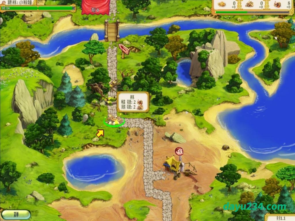 鼠标点击操作,开发农场,木材加工厂,收集金币,通过清理树木,修理道路,重建桥梁、以及被毁坏的各种建筑,根据游戏提示逐个的开发建设。