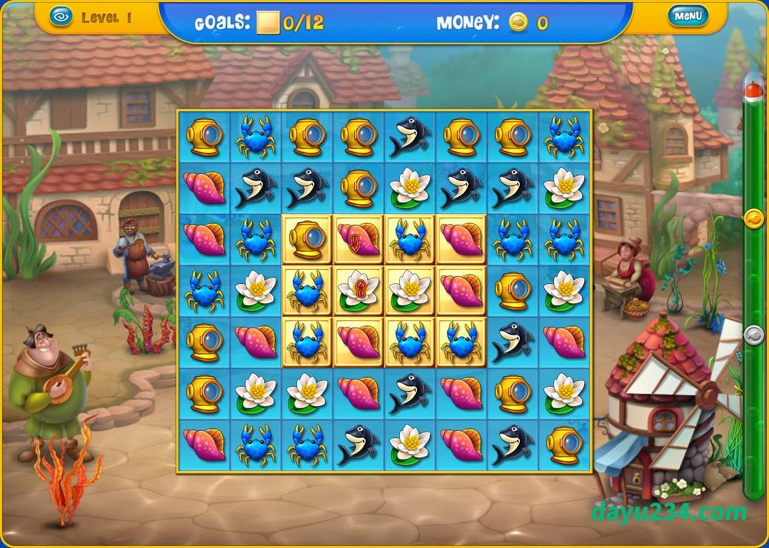 玩家需完成匹配消除关卡获取金币,通过消耗金币解锁鱼类和装饰物装饰水族箱。消除关卡采用经典三连交换机制,达成目标分数即可通关。游戏包含18种三维动态鱼类模型,可通过喂养互动观察其行为特征。
