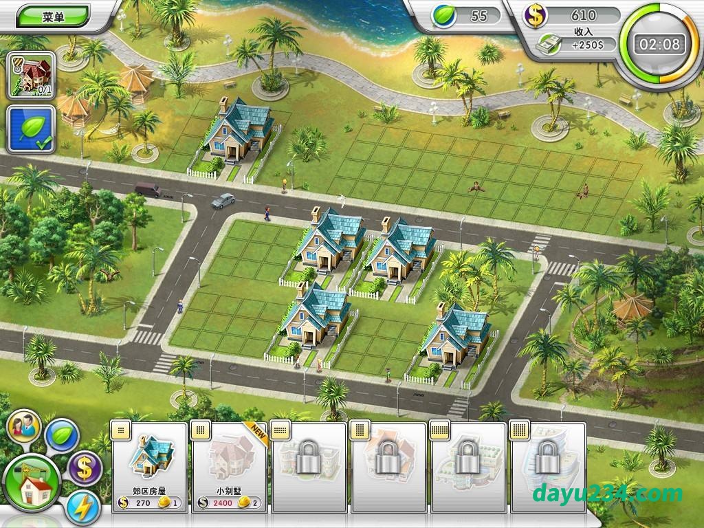该作并不是那种建立房子之后就可以一劳永逸的,而是以关卡的形式来进行游戏的。游戏总共有48个关卡,每个关卡会按照你完成当前关卡任务的时间来判定星级。