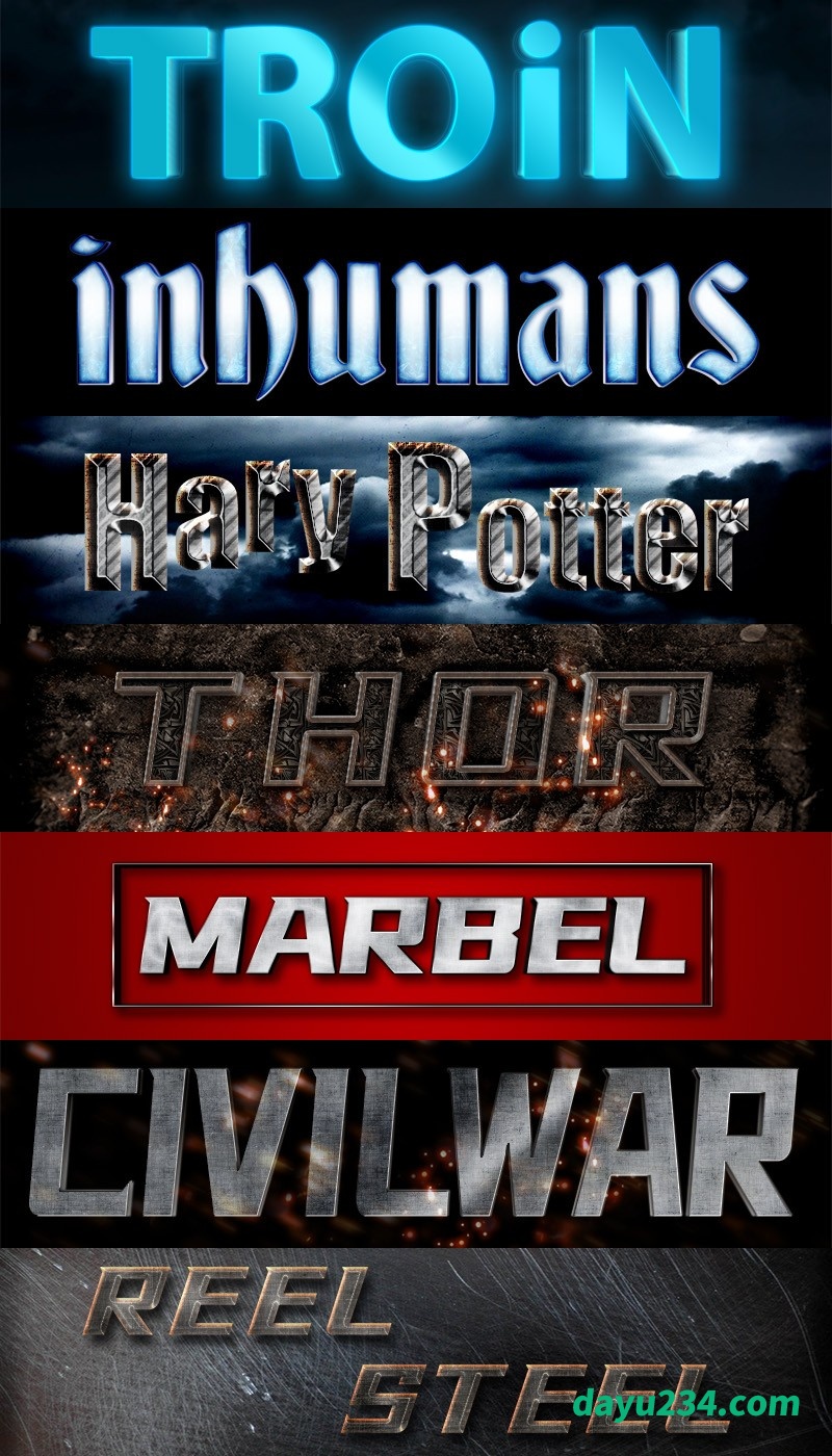 包含《创战纪》、《复仇者联盟》、《哈利波特》、《雷神索尔》、《漫威》、《美国队长内战》、《铁甲钢拳》等7套PSD样机素材,图层样式,Photoshop素材,PSD格式文件,可以直接编辑使用。