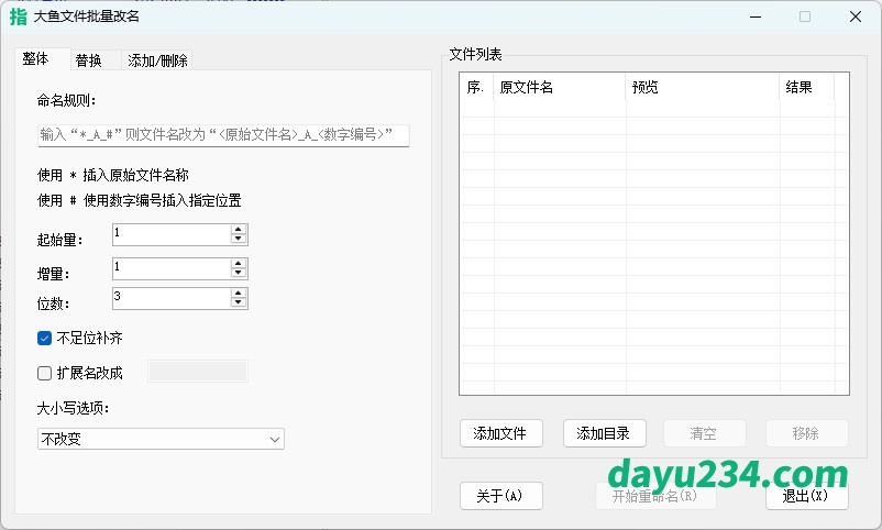 C#语言开发。主打一个绿色便携,界面整洁有序。单文件40K,小巧玲珑。支持数字序号、通配符、插入替换方式改名。