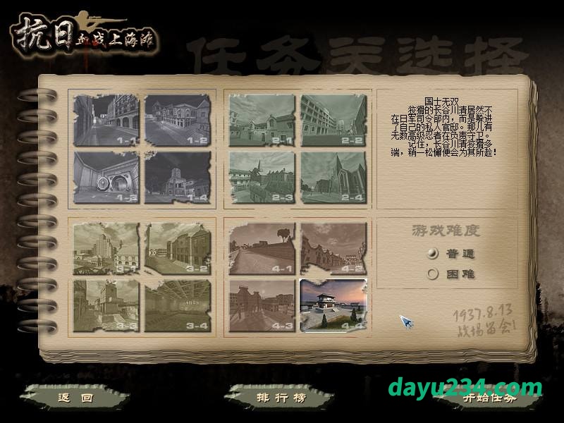 游戏背景设定在1937年卢沟桥事变后,中日在上海进行淞沪会战。玩家扮演抗日民间武装领导人华成龙,孤身深入敌后,完成一系列“不可能完成的任务”,最终手刃日军第三舰队司令长谷川清。游戏中真实还原了1937年的上海原貌,让玩家仿佛置身于那个战火纷飞的年代。